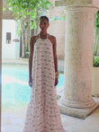 the Evelyn maxi dress is an elegant and modern piece. Its halter neckline offers a chic and refined look that beautifully elongates the silhouette, while the open back adds a feminine and graceful touch that highlights the figure. The wide skirt gives the dress comfort and fluid movement without losing its elegance. A delicate ruffle at the hem adds a distinctive and decorative detail, enhancing the final finish and giving the design an exclusive touch.