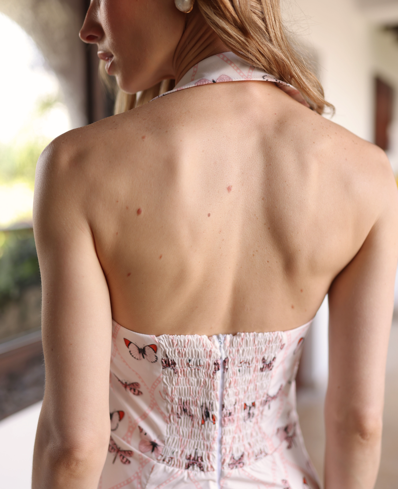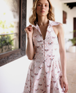 The Alice maxi dress is a modern and elegant piece. Its halter-style shirt collar adds a sophisticated and contemporary touch to the design. The bodice features structured panel cuts that shape and enhance the silhouette, defining the waist beautifully. From the waist, the maxi skirt flows effortlessly, creating graceful movement and a romantic, feminine effect while walking.