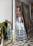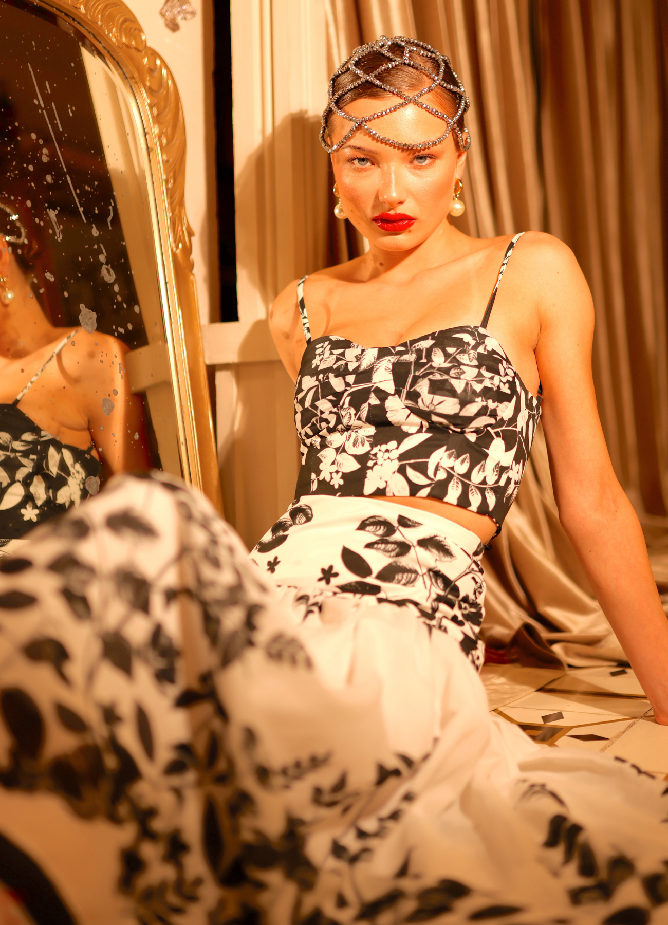 Maxi skirt with an asymmetrical cut and a semi-fitted silhouette that enhances the figure. It features a refined contrast between two fabrics, adding visual depth and a modern touch. The A-line ruffle includes a subtle transparency that provides movement and an airy, elegant finish.