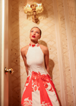 Maxi dress featuring a halter neckline and sleeveless design, crafted with a semi-fitted silhouette that enhances the figure. The A-line skirt is constructed with panel-like cuts reminiscent of “keels,” adding fluidity and a subtly architectural structure.