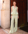 The Violette blazer is a blouse with an elegant and structured design that accentuates the feminine silhouette. Its notched lapel collar adds sophistication and formality. The garment is fitted and features a peplum detail, creating volume and movement enhanced by the crepe fabric.