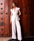 The Violette Blazer is a blouse with an elegant and structured design that highlights the feminine silhouette. Its lapel collar adds sophistication and a formal touch. The garment is fitted to the body and opens into a peplum, creating volume and movement, enhanced by the crepe fabric in which it is made.