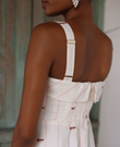 The Dahlia midi dress is an elegant and feminine dress. It features thin straps and a straight neckline that flatters the figure and creates a delicate look. The skirt has a sash that adds structure, streamlines the figure, and defines the waist. The full linen skirt provides movement and flow.