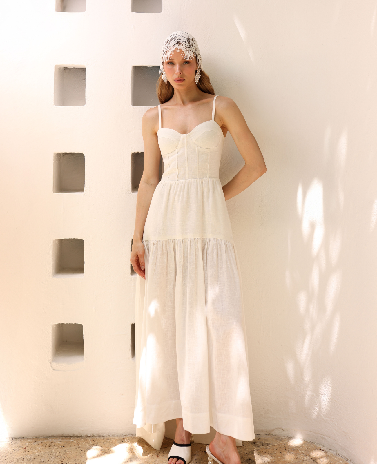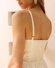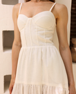 The Elinor midi dress stands out for its elegant and feminine design, designed to highlight the silhouette with delicacy. Its upper part gently embraces the body with thin straps and a corset-style neckline with pintucks, adding structure and definition while creating a beautifully sculpted effect on the figure.