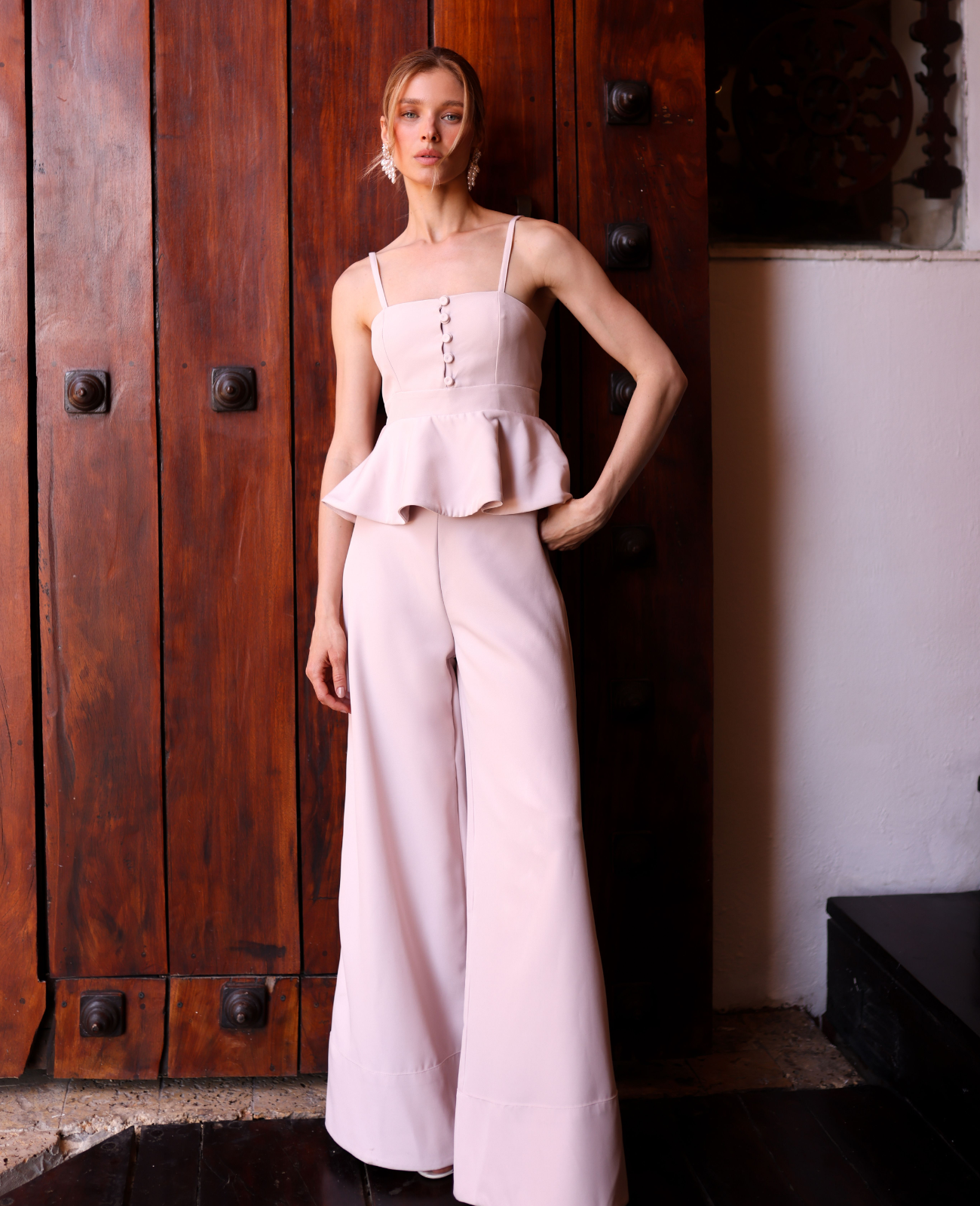 The Floria pants is a High waisted and palazzo pant than enhace the silhouette with a fluid and flatterin soft grape. The structure visually elongates the legs, while the lightweight construcción provides comfort without compromising elegance. Timeless and sophisticated, they are perfect for creating impeccable looks both during the day and for special occasions.