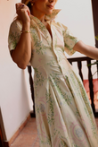 This long shirt-style dress evokes classic elegance with a romantic touch. Its structured silhouette with a collar and front button closure is balanced by a wide, paneled skirt that adds movement and fluidity. Perfect for standing out with subtlety and sophistication.