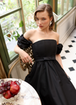 Dress featuring a straight neckline and a corset-style bodice with internal boning for structure and support. Includes removable side sleeves for a versatile look. The midi A-line skirt is finished with two layers of horsehair braid, adding volume and graceful movement.