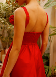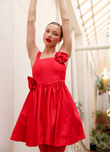 Mini dress featuring a fitted corset-style top with internal boning for structured support. Adorned with floral appliqués that function as decorative brooches, adding a feminine and unique touch. Finished with functional side pockets for added practicality.