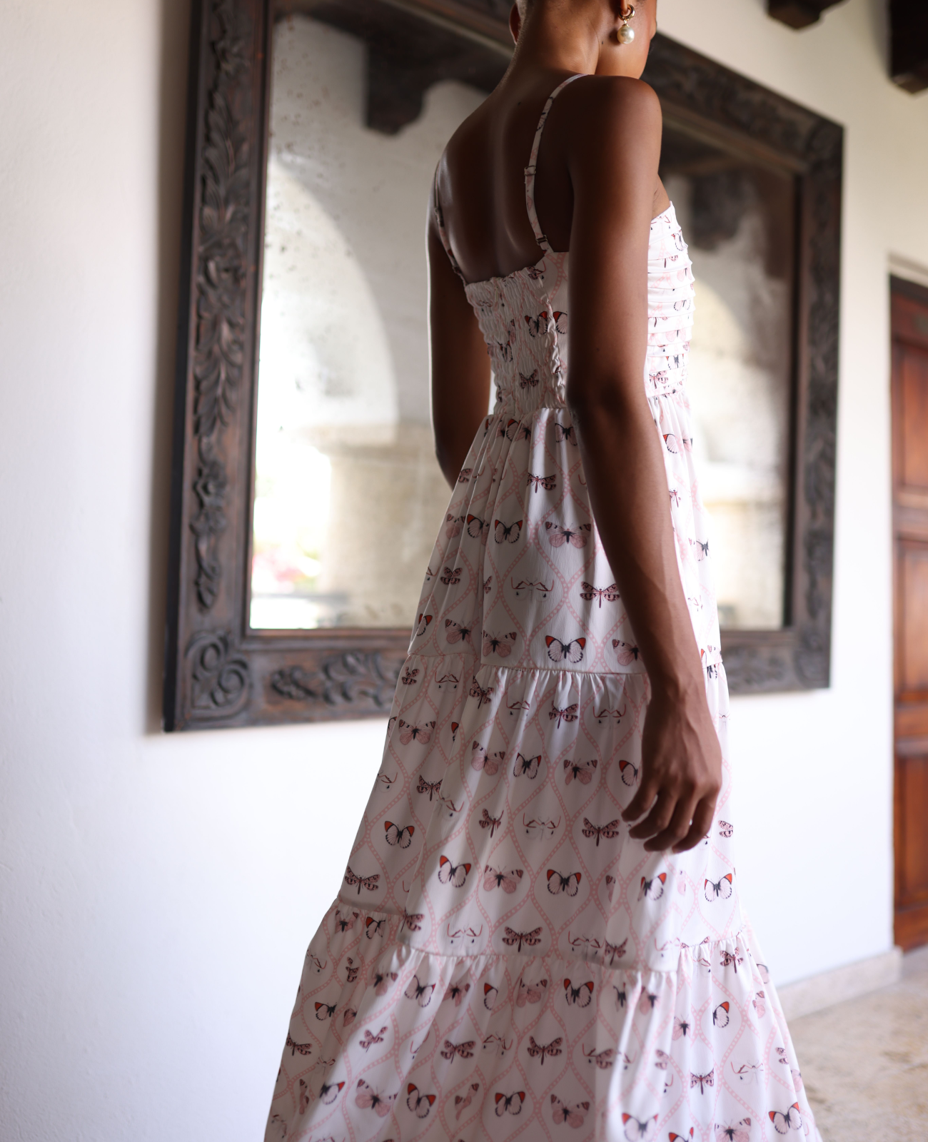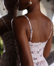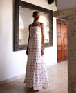 The Taylor maxi dress is an elegant and fresh piece. Sewn in silk, it feels light and fluid, creating graceful movement with every step. The straight neckline features delicate pintucks that add distinction and femininity while subtly enhancing the silhouette, complemented by thin straps that give the design a refined look. A hip yoke helps define the waist and shape the figure, providing structure and elegance. The tiered ruffles add volume, movement, and flow to the wide skirt, creating a romantic and sophisticated finish.