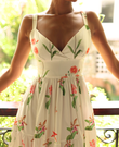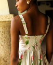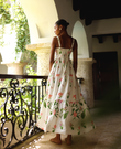 The Tilly maxi dress is a romantic and feminine dress. It features a crossover V-neckline for a flattering silhouette and a fitted waist. The skirt is made of ruffles for movement and a fluid drape.